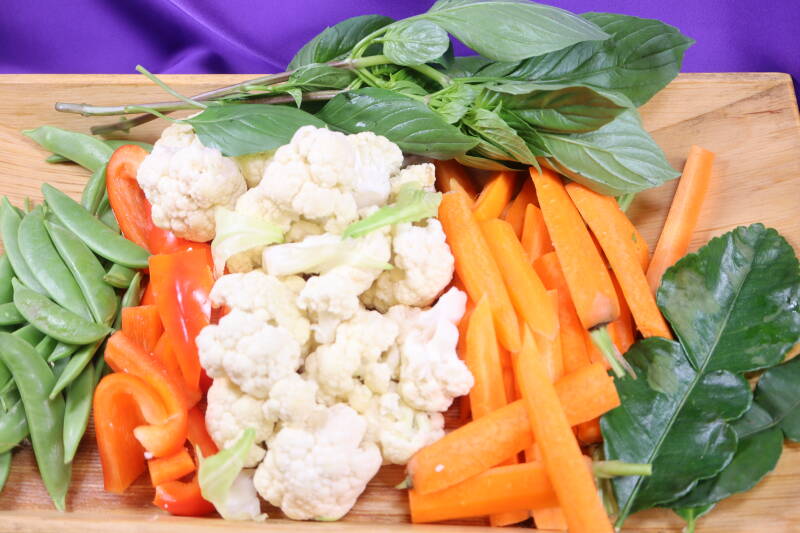Når sausen er passe tykk og grønnsakene er kokt men fortsatt sprø tilsetter du sukkererter og thai basilikum.