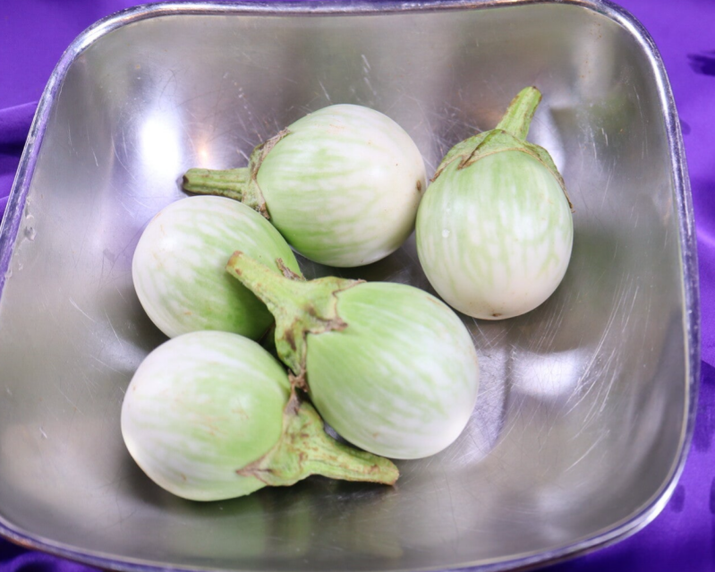 Det er vel mer tradisjonelt med små thailandske auberginer som ser ut som egg med en stilk eller bambus skudd i denne retten enn norske sommer grønnsaker.