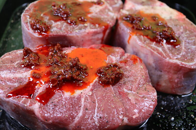2-3 stykker okse skank eller oksehaler i skiver. Til sammen ca. 2 kg. Bruker du høyrygg eller kjaker uten bein er det nok med ca. 1 kg
