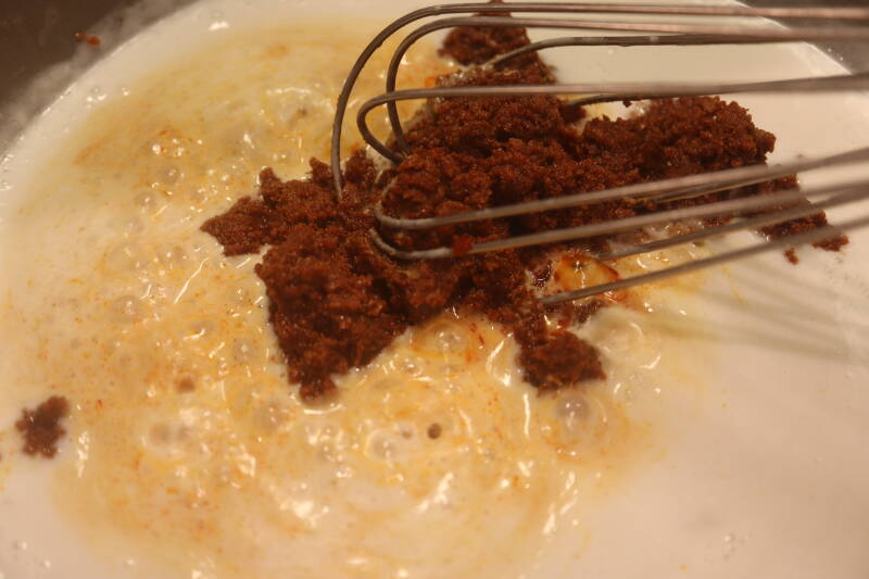 Selve karri delen av retten skal lages ved å koke opp kokosmelk til den er lett redusert og har begynt å skille ut fett. Bruker du ferdig Massaman karripasta bruker du 150 g av denne, eller så følger du oppskriften for å gjøre din egen versjon med utgangspunkt i en standard rød karripasta. Denne mengden med karripasta er til en stor porsjon. Jeg brukte rundt 2 kg skank med bein, til 700 -800 gram rent kjøtt holder det med ca. 100 gram karripasta.