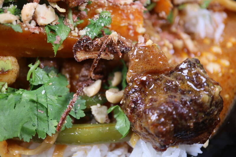 Tilsett så kjøttet som er renset for hinner og fett og del det i biter. Er det fortsatt marg i beina kan denne pirkes ut og tilsettes sausen. Sil kraften fra breseringen og tilsett den konsentrerte smaksrike væsken i sausen. Kok opp gryten og la den koke i minst 10 minutter. før du tilsetter grønnsakene. Når gryten koker, bruker du tiden til å rense grønnsakene, og deler disse i passe biter. Tilsett bambusskudd i skiver, gulrot i staver og buketter av blomkål til gryten og la dette koke i ca. 10-12 minutter før du tilsetter de grønne bønnene. Kok bønnene til de er er passe møre og grønnsakene er myke. Imens rister du peanøttene i ovn ved 180 grader i ca. 10 minutter eller i en varm airfryer i ca. 6 minutter, til de blir sprø. Avkjøl nøttene litt før du grovhakker de, og tilsetter halvparten til gryten. Resten strør du over sammen med sprøstekt sjalottløk ved servering sammen med ferske koriander blader.