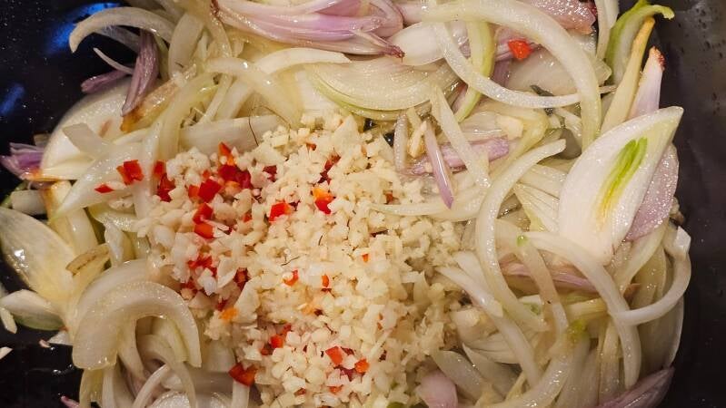 Løk, hvitløk, ingefær og chili sammen med karri pasta er basisen i denne retten foruten om eggene.