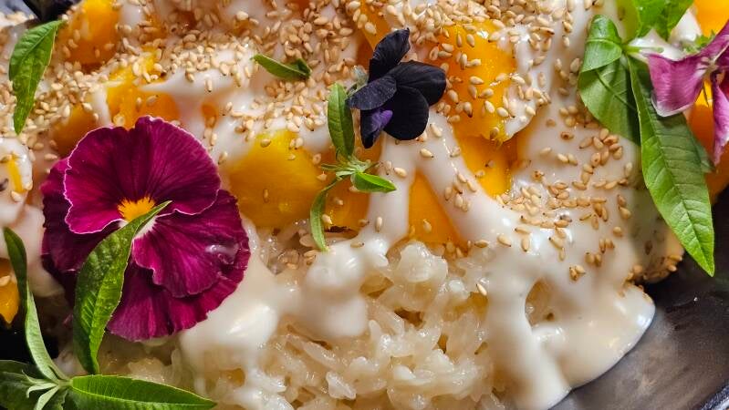 Legg en porsjon av den søte kokos risen på en tallerken, anrett mango skivene på eller vedsiden av risen, hell over litt av den salte topping-sausen. Avslutt med å strø de ristede sesamfrø eller mungbønner over retten. Retten er smakfull men enkel i presentasjonen. Pynt med spiselig blomster og sitronverbena.