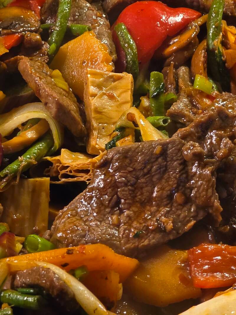 Saftige biter av kjøtt i med sprø grønnsaker og biter av tofu skin sticks.