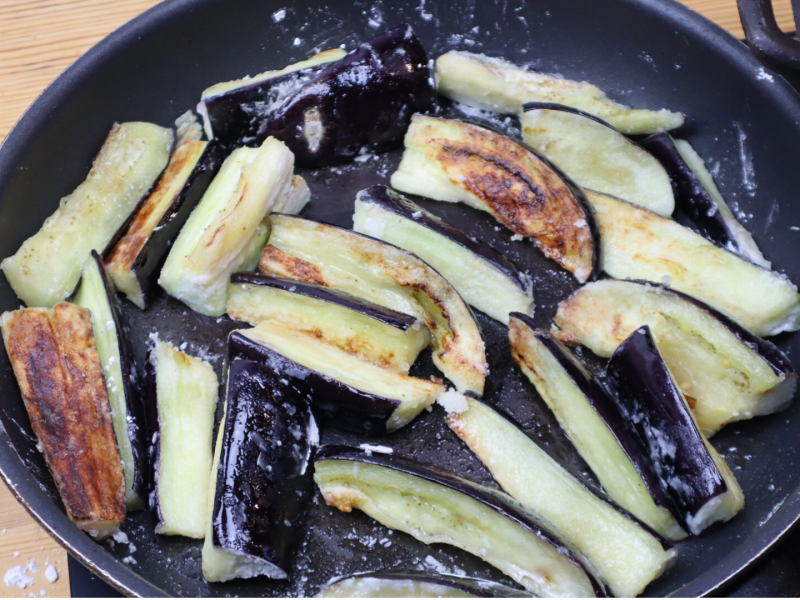 Tradisjonelt brukes wok men det er bedre med en stor panne når du skal steke de da det er letter å få brunet auberginen jevnt. Stek eventuelt i to omganger om du ikke får plass til alt i en panne.