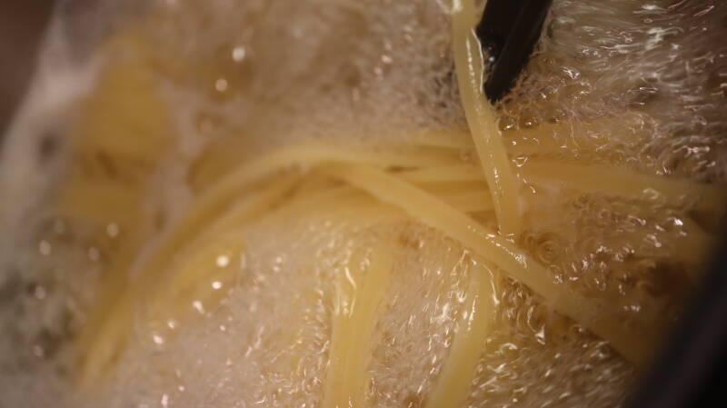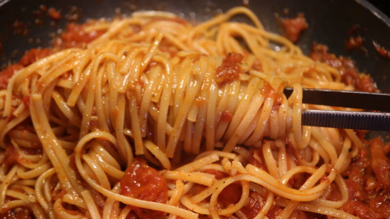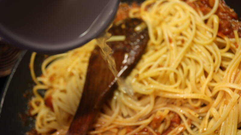 • Kok så pastaen ferdig i ca. 2 minutter mens du rører hele tiden. Det stivelses rike vanne hjelper til på konsistensen og pastaen tar til seg smaken av sausen.