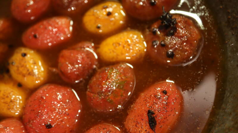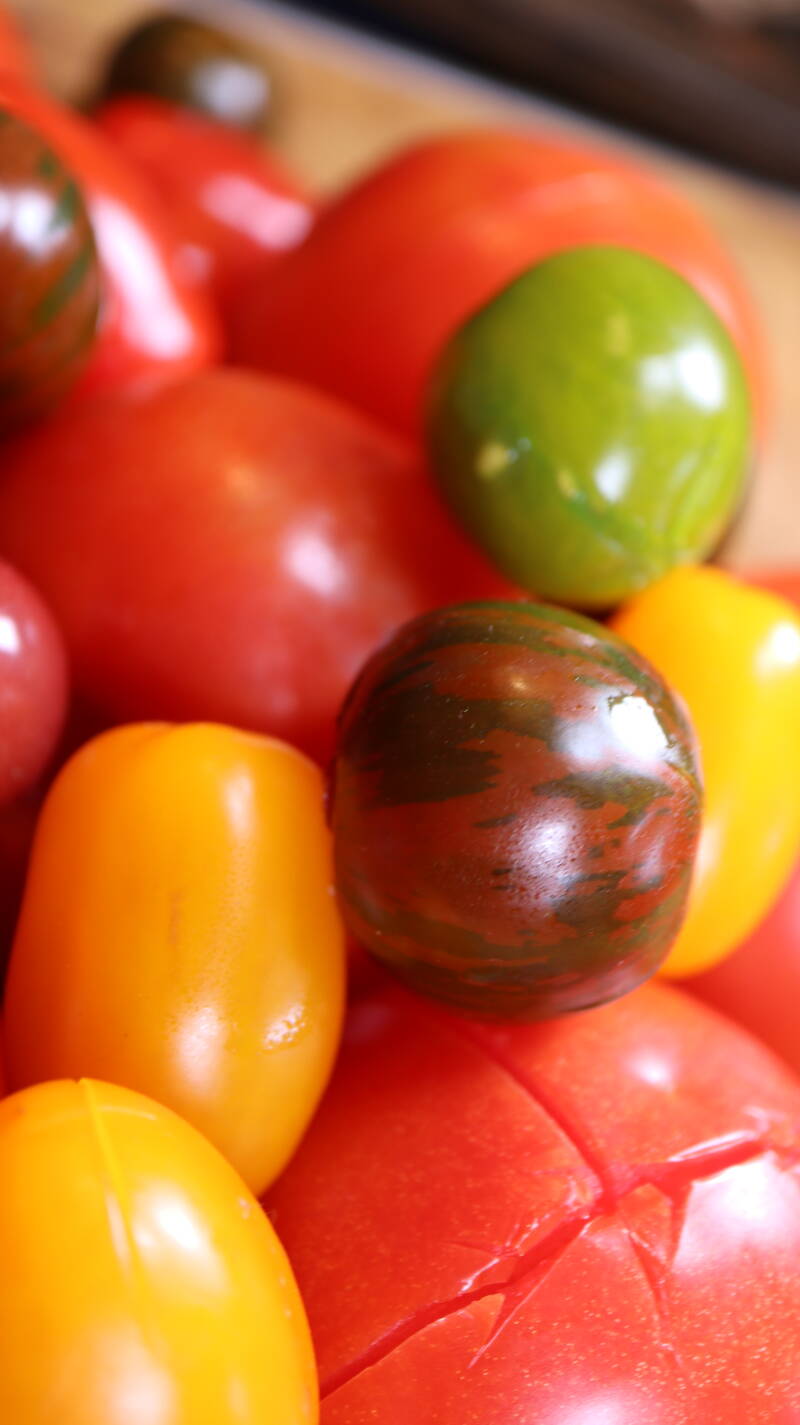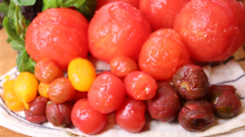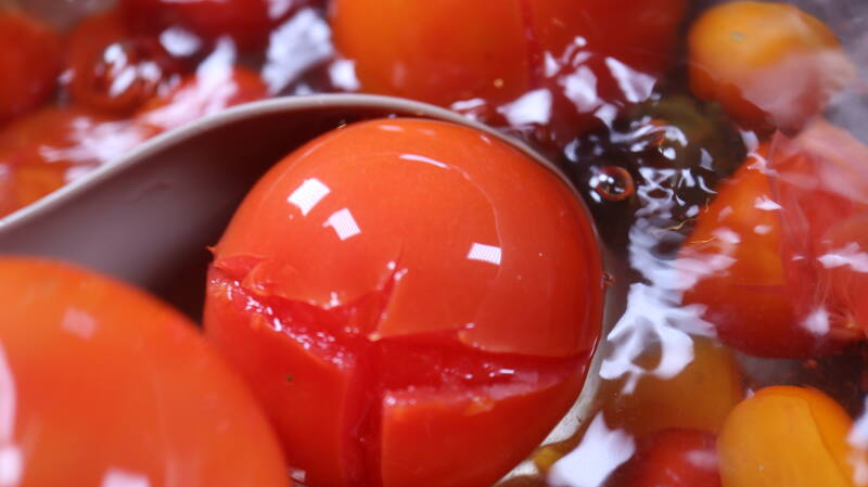 Gode tomater er alfa omega for denne enkle retten. Bruk solmodne tomater av beste kvalitet. Min favoritt er plommetomater men det er ikke alltid jeg får kjøpt disse. Bland gjerne noen typer tomater for en mer kompleks tomat smak. Får du tak i San Marzano tomater er disse veldig gode og har bra balanse mellom sødme og syrlighet. Til de konfiterte tomatene bruker du Cherry tomater eller mini plomme tomater. Jeg brukte en blanding der noen tomater var mørkegrønne, som så flotte ut rå men viste seg nesten umulige å skrelle.  Dessverre må du skrelle eller flå tomatene før du lager denne retten. Bruk eventuelt gode hele San Marzano og Cherry tomater på boks hvis du vil unngå dette, da disse allerede er flådd.