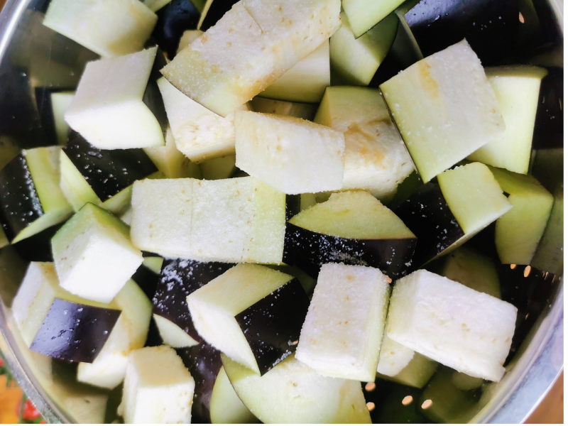 - Tørk aubergin terningen på papir/klede.