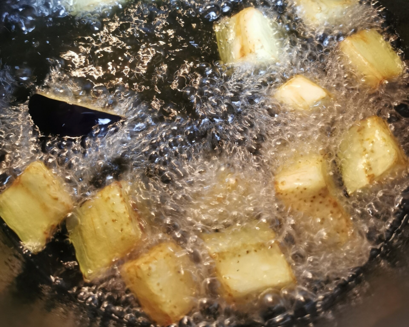 - Samtidig varmer du opp nøytral olje til fritering og friterer aubergine terningene ved 180 grader. Du må gjøre dette i flere omganger og pass på at oljen blir varm mellom hver omgang. Legg auberginen på absorberende papir for å fjerne overflødig olje etter fritering.