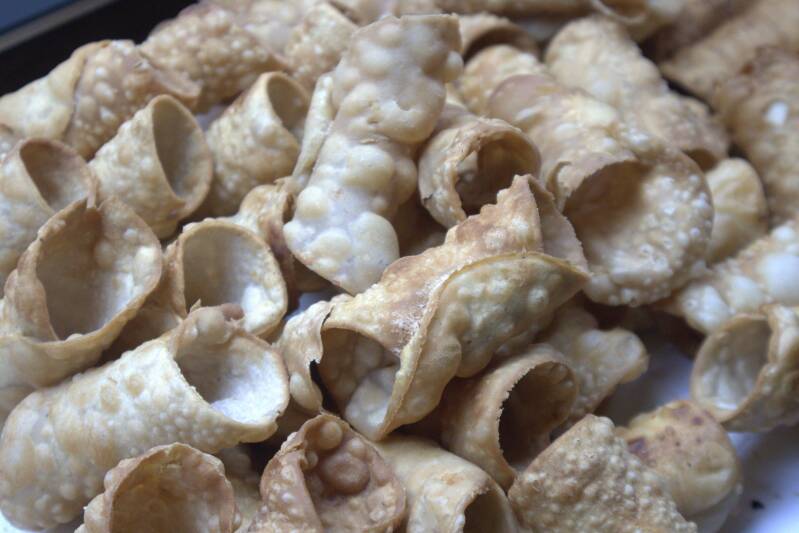 Jeg må friterer disse sprø skjellene i flere omganger. Varm oljen til opp mot 180 grader og ha stål rørene dekket med deigen i den varme oljen. Snu de underveis og ta de ut når det er sprø og fått en jevn gyllen farge. La de renne av seg på absorberende papir eller et klede og la de avkjøle seg. Klarer du å lirke røret ut fra kaken mens det ligger i oljen, blir deigen ekstra sprø inni . La rørene avkjøle seg litt før du ruller ny deig rundt. Har du fått litt for mye egge hvite på deigen før friteringen kan det være vanskelig å trekke røret ut mens de fortsatt ligger i oljen. Friter da kaken sprø og fjern røret når det har blitt kaldere og lettere å håndtere.