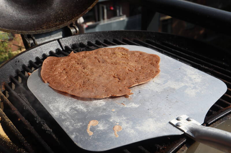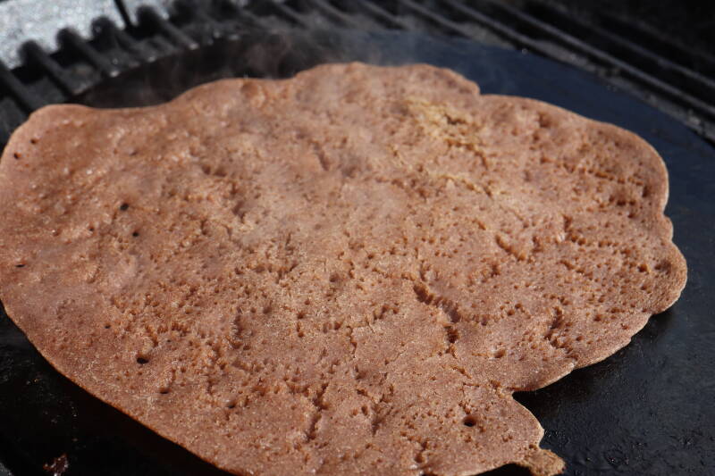 Jeg lokket lokket på grillen men bruker du panne er det viktig at du steker Injera lefsen med lokk.