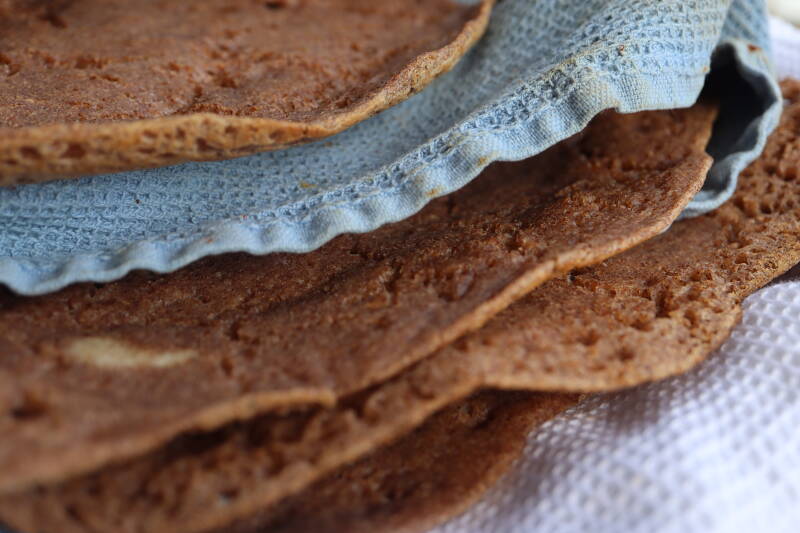 Hvis deigen ikke har hevet seg tilstrekkelig, Tar du av 50 g og mate den på nytt med 50 g vann og 50 g mel Sett den til side på en lun plass og la den jobbe i nye 8 timer. Hvis den da reagerer rasker, og hever seg til mer enn det dobbelt, er den klar til bruk. Jeg måtte gjøre dette en gang. Det kan h vært surdeigen min som ikke var aktiv nok, til å starte med eller at den reagerte på Teff melet. Hvis du må gjøre dette, blir det litt på samme måte med surdeig som du pleier å mate med rugmel, og skal skifte til hvete bakst. Da må du tilvenne surdeigen, gjennom å mate den med hvete, for å få en sterk nok surdeig som reagerer forutsigbart. Planlegger du å lage mye Injera, kan du eventuelt ha to kulturer gående. Disse lefsene er mest sannsynlig et av det sunneste alternativet, til både hvete og mais baserte tortilla. Siden de har en helt egen smak, og en litt løsere i konsistensen, kan ikke akkurat erstatte disse til fredags Tacoen. Eller kanskje? De er i alle fall enklere å lage en mais tortilla, og de fungerer utmerket til sterk mat.