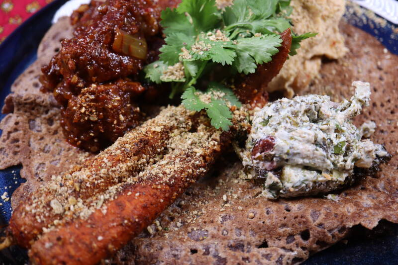 Ikke helt autentisk Etiopisk, men Sega Watt med Harissa bakte gulrøtter, grønnkål dipp, hummus og hjemmebakt Injera lefse.