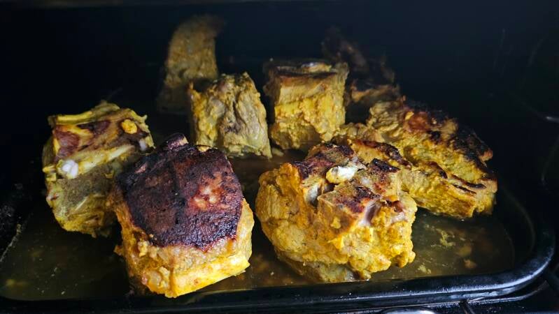 Jeg har laget min rett i to prosesser. Det marinerte kjøttet ble stek i en "Ninja Woodfire Oven". Dette er en fantastisk utendørs ovn, som jeg har funnet ut at det er lett å brune større mengder kjøtt i. Du kan sikkert bruke en innendørs ovn eller på komfyren i en jern gryte. I jern gryten må en ofte gjøre dette i flere omganger, hvis man skal lage en større porsjon.
