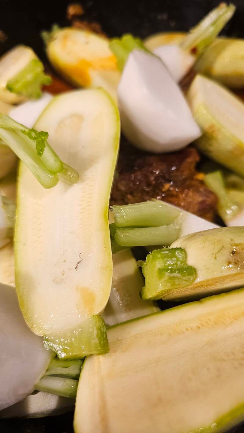 Når kjøttet har kokt litt i sausen kan du tilsette grønnsakene.