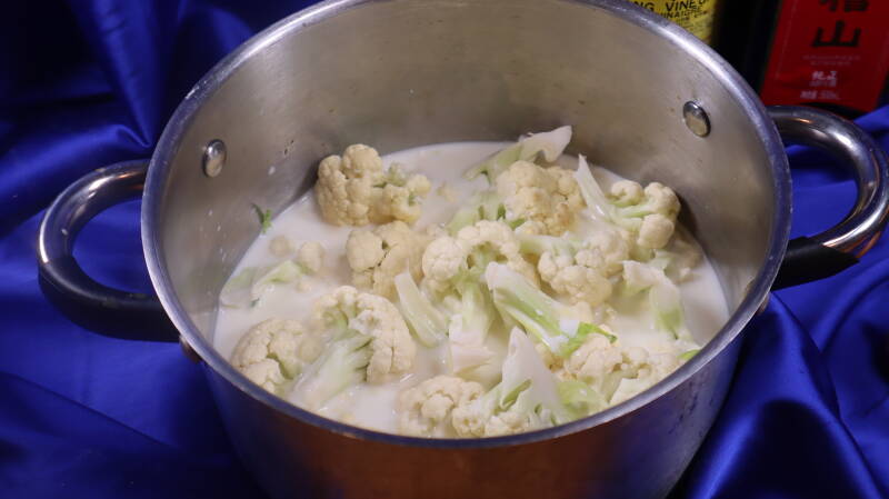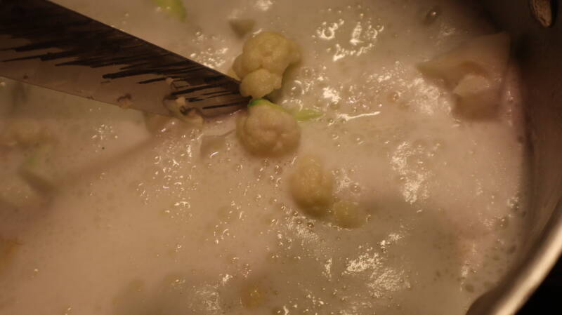 Kok blomkålen til den er er møre ca. 5-7 minutter. Du må koke den til den er mør men ikke i hjel kokt. Er den for lite kokt vil du ikke oppnå en helt glatt puré og koker du den for lenge vil smaken bli litt dvask. Jeg bruker en kniv for å sjekke konsistensen på kålen.
