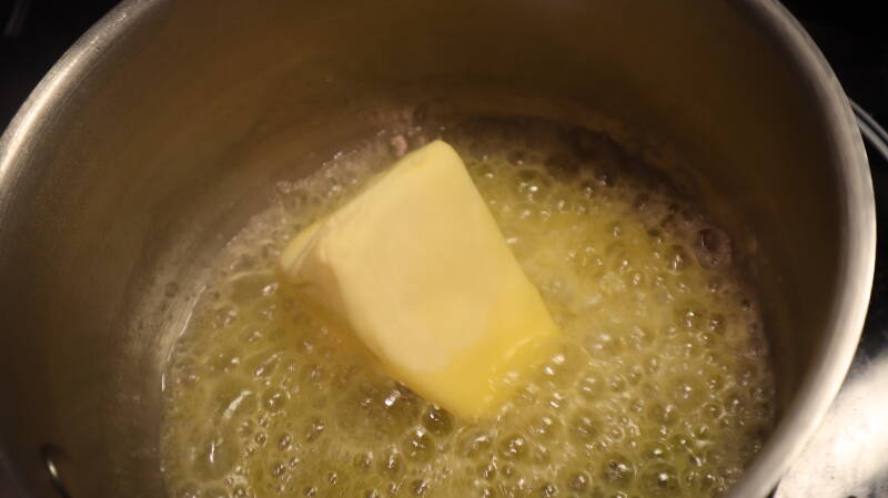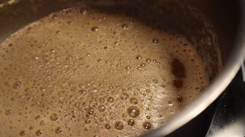 Imens du lager ferdig puréen bruner du smøret og setter det til side til når du skal lage ferdig retten. Varm det så opp og ha i soyasaus og chiliflak. Jeg brukte den milde Gonchugaru chilien som kommer fra Korea. Dette er en meget mild og fruktig chili. Har du ikke denne kan andre typer chili flak benyttes. Har du bare sterke chili må kan du redusere mengden litt.