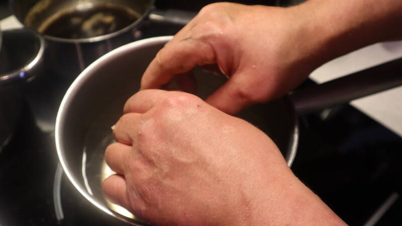 Du kan servere retten med bare disse to elementene, men jeg skal server den til en lunsj, så jeg ønsker at retten skal være litt mer mettende. Ristet sopp på en bruschetta av grillet landbrød har jeg ofte toppet med posjert egg. Dette vil tilføre retten mer metningsverdi. Men siden jeg har en rik puré av blomkål vil jeg ikke å legge soppen på grillet brød. Hollandias som jeg ofte bruker på soppbruchetta med posjert egg, føltes for rikt og fett men blomkålpuréen. Men retten trengte noe mer og valget falt på brunet smør med litt soyasaus og gonchugaru. Det tilfører enda mer umami og litt fylde men vil ikke føles like rikt og fett som hollandésen. Denne retten er min hyllest til de søte små baby kantarellene. Retten skal spises med andakt og serveres med et glass fyldig hvitvin til en god lunsj.