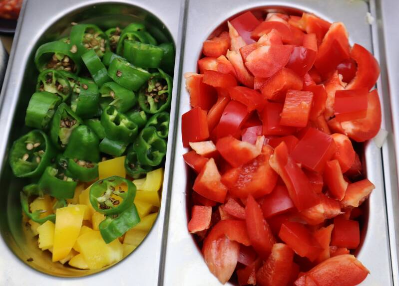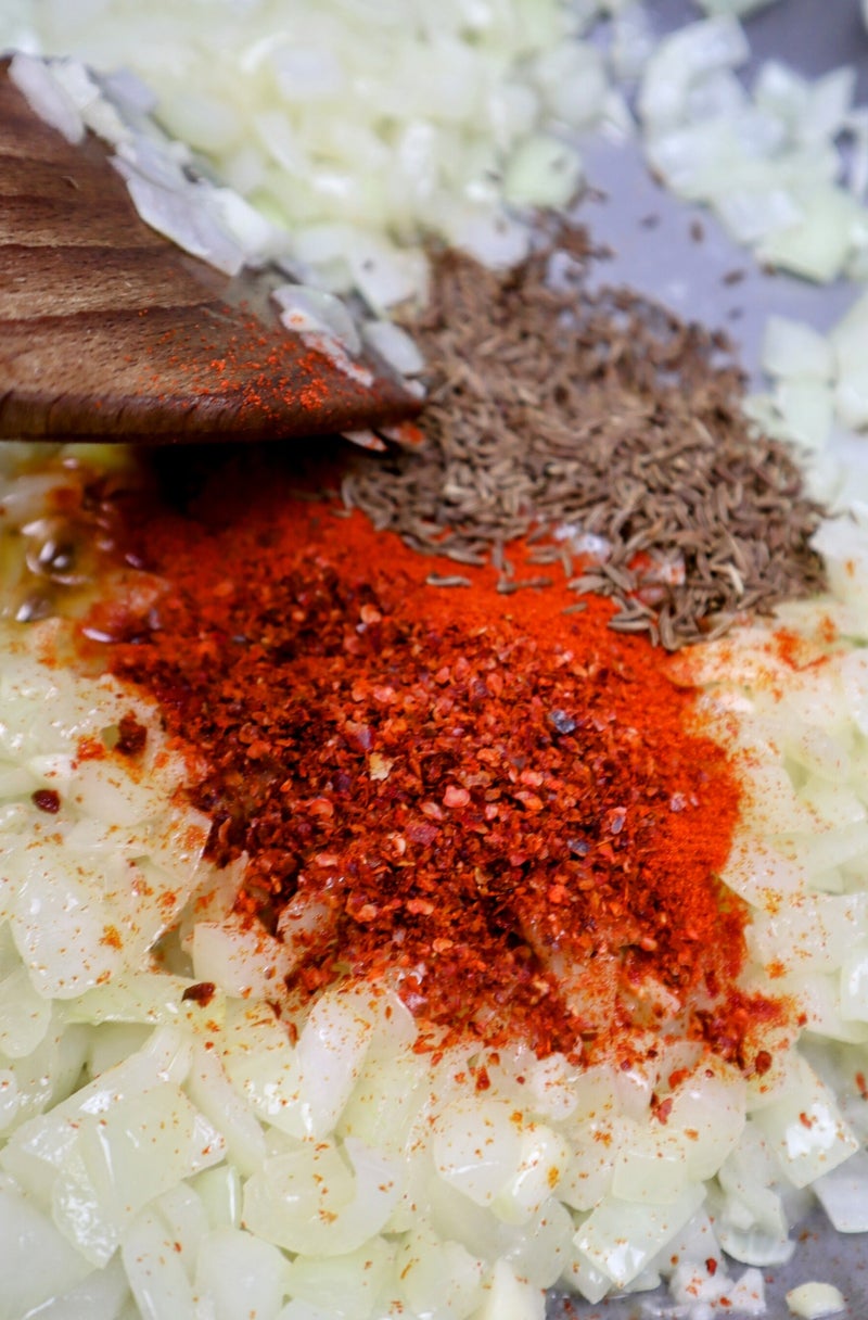 Mens kjøttet koker kutter jeg gode grønnsaker og den krydret pølse smått. Starter med å frese løken blank i litt andefett og tilsetter hvitløken, karve og paprikapulver som får surre litt på lav varme før pølsen tilsettes. Til slutt tilsetter jeg grønnsaken og lar dette surre sammen på lav varme.