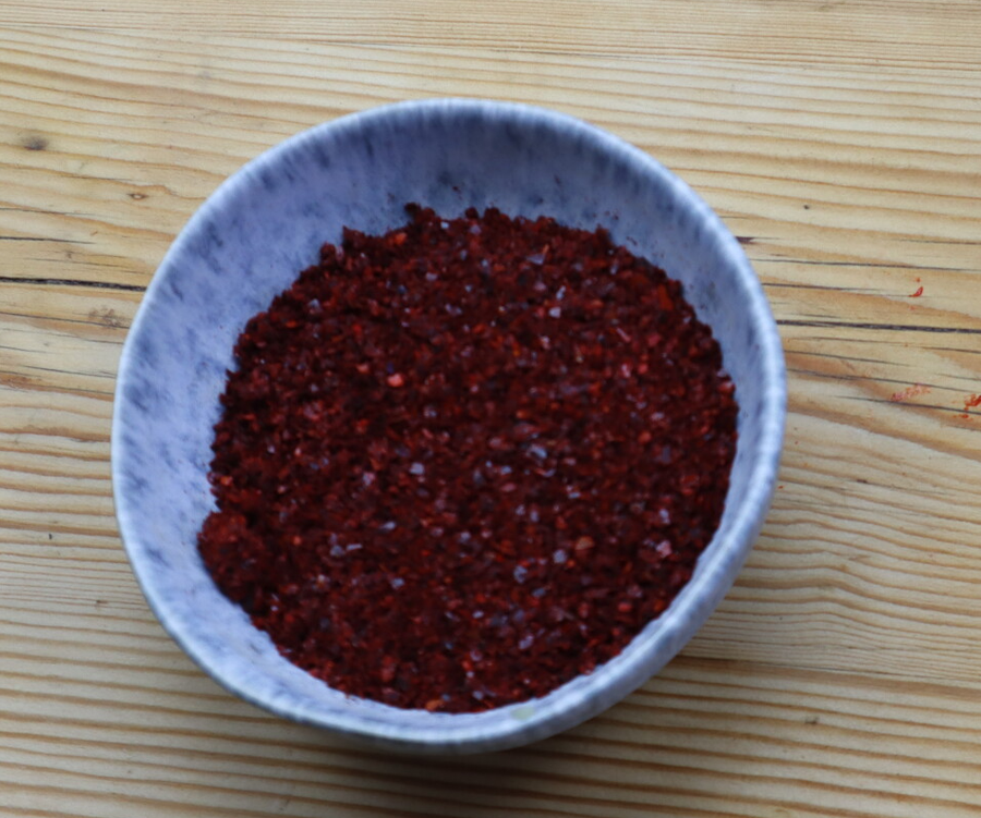 Den er forholdsvis sterk på smak med fruktighet og en lett røykaroma. Her var også selve navnet fraværende på selve pakken, den het bare Red pepper powder. I noen oppskrifter oppskrift blir det anbefalt at chilien skulle være finmalt for å løse seg opp i sausen men jeg fant bare denne typen i
