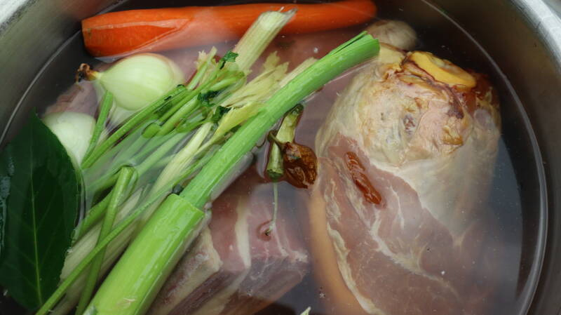 Min versjon i dag er av den rustikke versjonen med flere typer kjøtt og bønner. Jeg kokte kidneybønner for seg og brukte både bønner og kraften i selve suppen. Den resterende kraften kom fra en kjele der storfekjøtt fra bog og bringe fikk koke sammen med en røkt svineknoke.