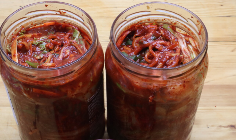 Press ned massen hver dag for å forsikre deg om at alle luftlommer er borte og alle grønnsakene er dekket av væske. De skal stå i romtemperatur i ca 3 dager. De kan spises fra dag en - uferdig kimchi som blir servert som en form for salat kalles geotjeori. Kimchi holder seg godt og er spiseklar etter ca 2 uker. Har du lagd for mye kimchi og den begynner å bli dvask blir den brukt opp i en tradisjonell gryterett med svin, tofu og egg. Du kan prøve å server kimchi ved siden av asiatisk mat men også prøv deg frem med den ved siden burgere og andre retter som du ellers ville brukt noen syltede agurker eller liknende ved siden av. Eller lag din egen versjon av svinenakke bresert i kimchi - lag den så til som pulled pork Korea stil, bruk evt sausen fra min oppskrift på Kylling i fyr å flammer når du varmer opp den ferdige kjøttet som en bbq saus. Server med strimkede grønnsaker og bao brød en fredag, som et alternativ til Taco.