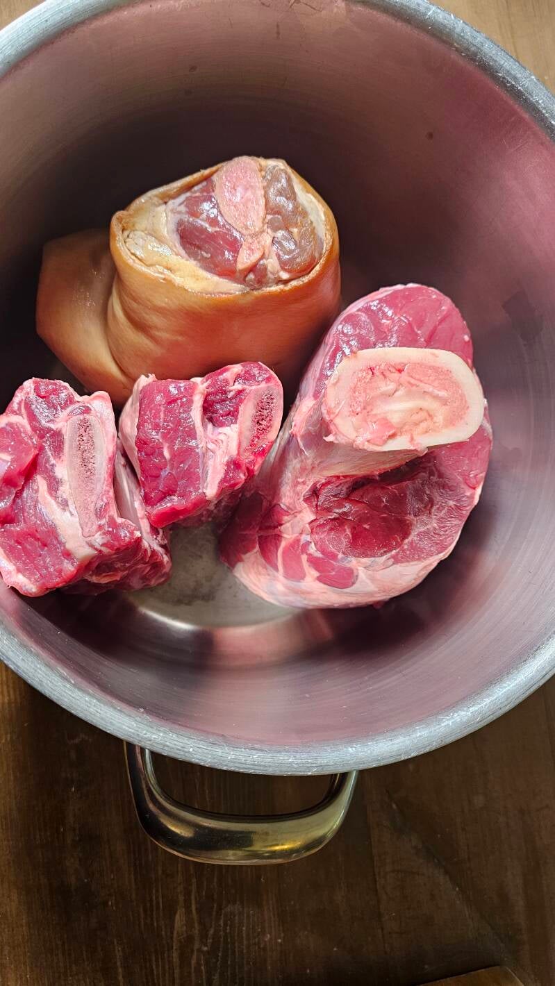 Dette steget tar tid, men er fundamentet for hele måltidet. Det er tradisjonelt koke kjøtt fra storfe som benyttet, "ferskt kjøtt" er en del av tittelen. Men for å få enda fyldigere og smaksrik kraft velger jeg å bruke en knoke fra svin også. Den bruker jeg til suppe retten mens storfe kjøttet ble til selve hovedretten.